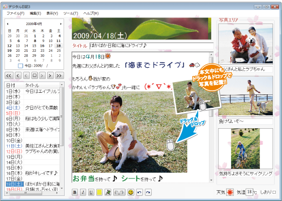 デジカメ写真など日記にまつわる画像を加えることができたり、