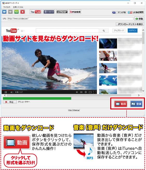 ※本ソフトはYouTube、ニコニコ動画、USTREAM、FC2動画の動画・音楽(音声)をダウンロードして、