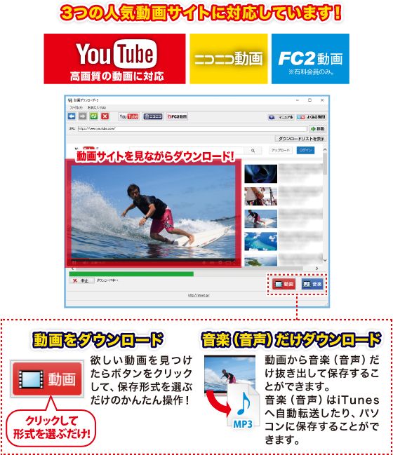 YouTubeやFC2動画のHD画質(高解像度)の動画のダウンロードにも対応、