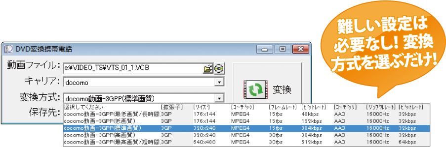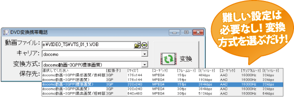 お手軽に携帯電話用動画ファイルに変換することもができます!