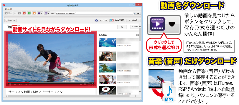 ダウンロードして、iTunesに登録、PSP・WALKMAN・Androidへ転送またはパソコンに保存します。