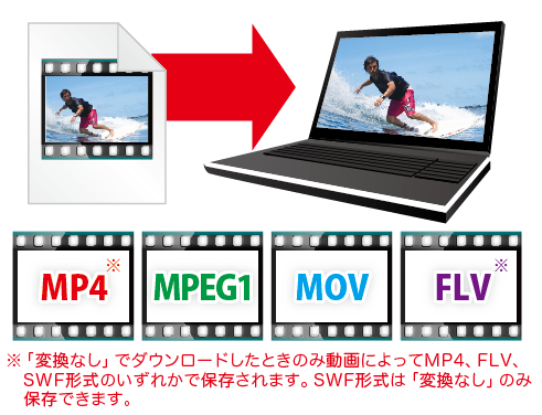 ダウンロードした動画はMP4 / MPEG1 / MOV / FLVのファイル形式で保存、