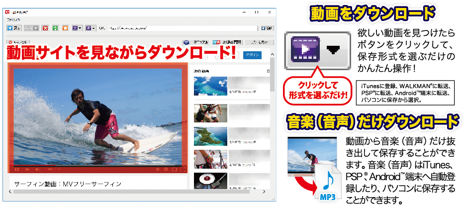 ダウンロードした動画や動画の音楽(音声)だけを、iTunesへ登録やPSP・WALKMANへ転送、