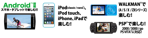 | 対応端末 | iPod、iPod touch、iPhone、iPad、WALKMAN、PSP、PS Vita、Android搭載スマートフォン・タブレット ※PS Vitaは手動の転送となります。 |
