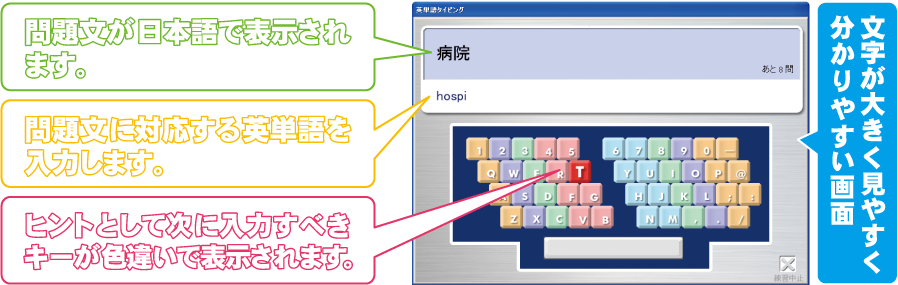 画面には、日本語の問題と、次に押すキーボードが表示されます。
