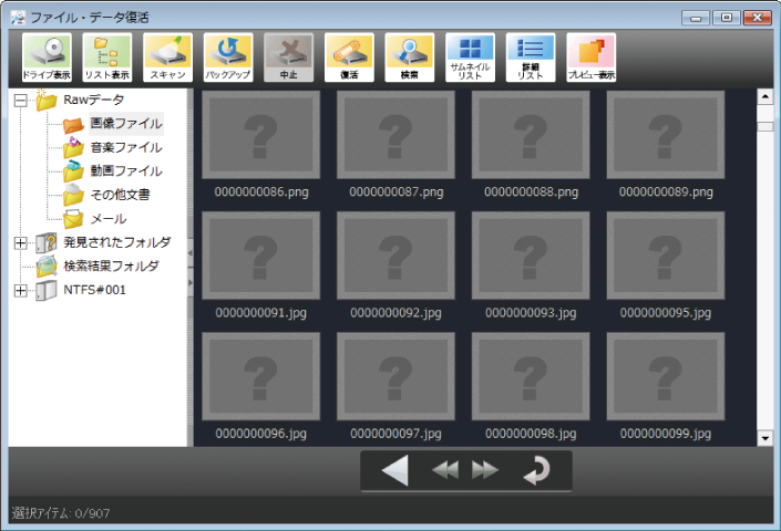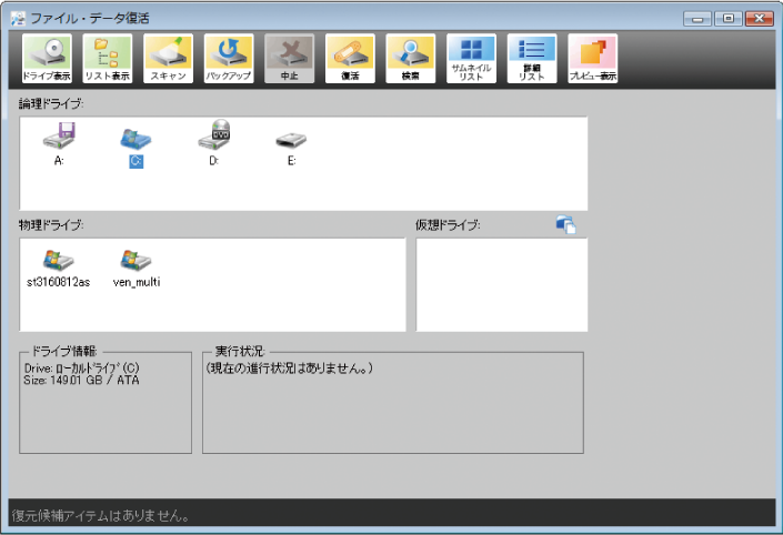 スキャンボタンをクリックすると、選択したドライブのスキャン(検索)作業を行い、