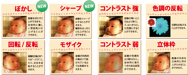 今までの機能に加え、新たに「ぼかし」「シャープ」機能を追加しました!