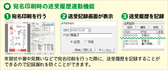 「年賀状」や「暑中見舞い」等の送受記録を宛先ごとに記録できます。