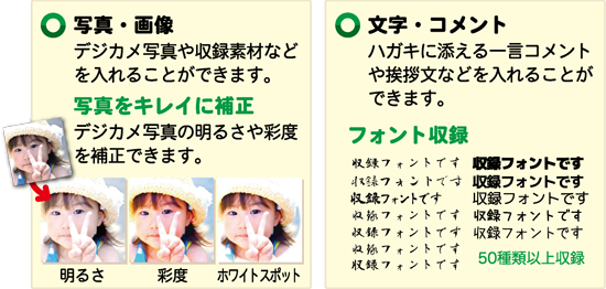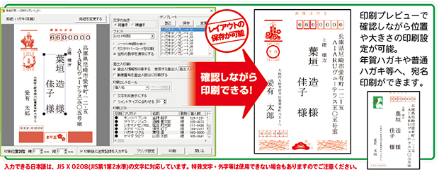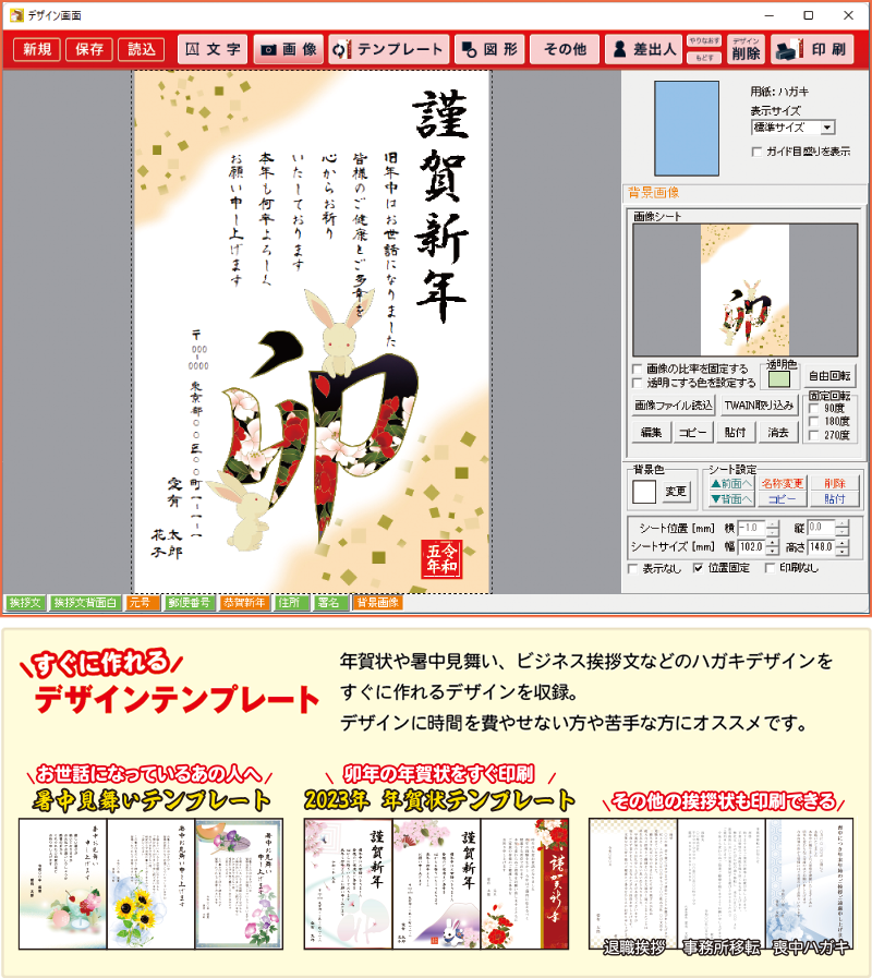 デザインされたテンプレートを使ったハガキ裏面の印刷や、