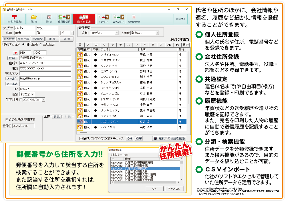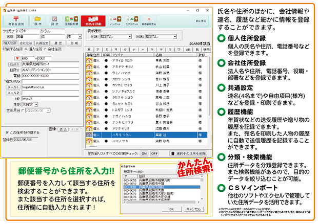 操作が分かりやすい住所録画面で宛名を登録し、宛名印刷もできます。