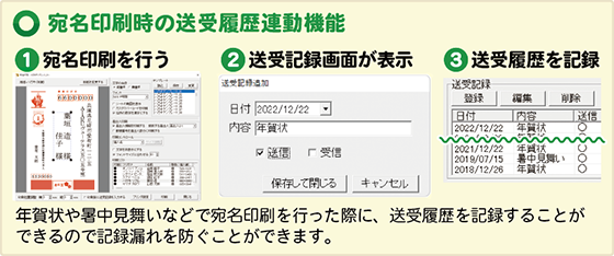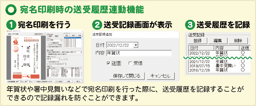 「年賀状」や「暑中見舞い」等の送受記録を宛先ごとに記録できます。