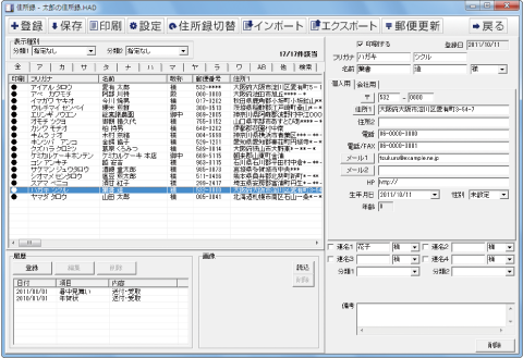 住所録データは11個まで作成でき、登録した内容を一覧印刷することもできます。
