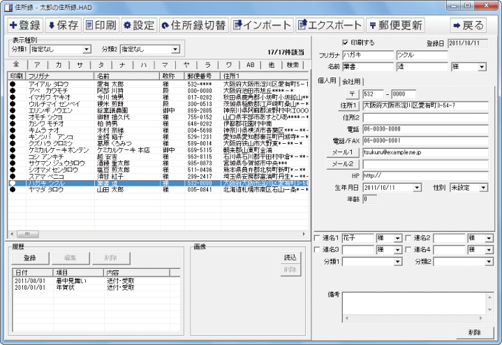 住所録には住所だけでなく送付履歴や名刺などの画像も登録することができます。