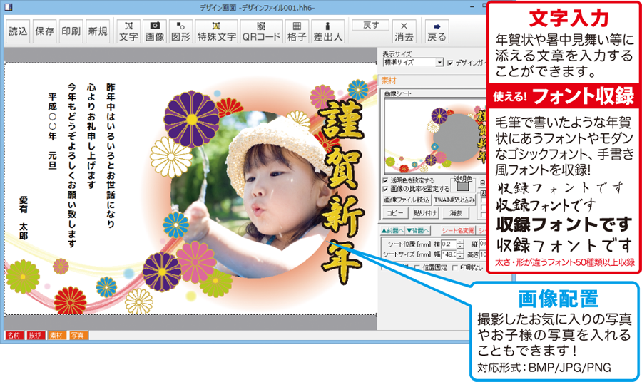 デジカメ画像や収録されている素材、フォント、図形、文字、QRコード等を使用して