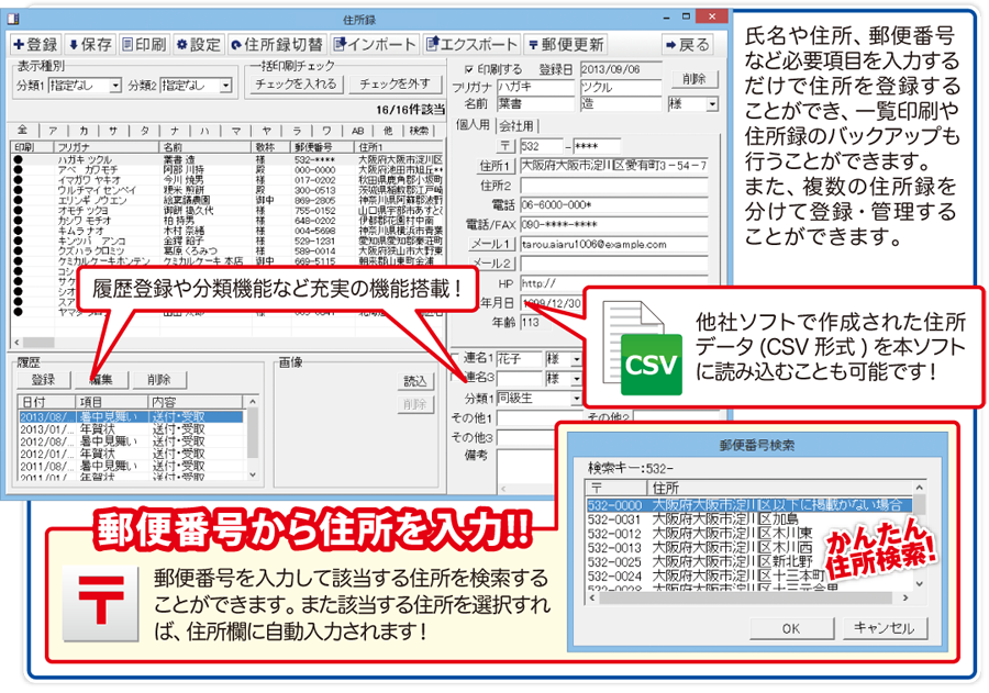 住所録は複数作成でき、家族や会社内など複数の人で使用するときに便利な他、