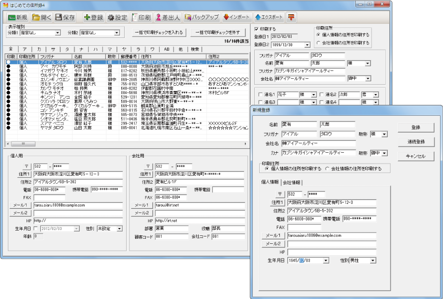 個人住所・会社住所・電話番号・メールアドレス・履歴を登録することができます。