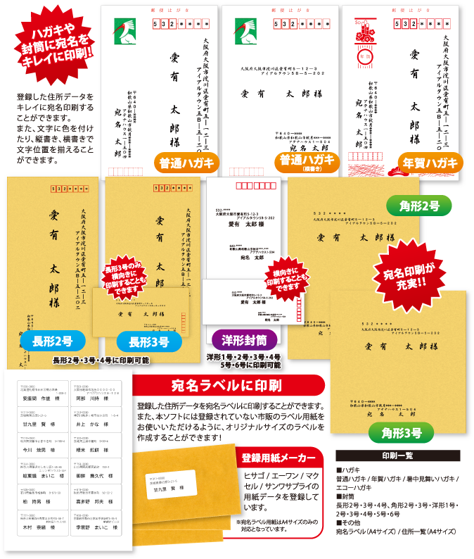 ハガキ、長形・角形、洋形(縦)、洋形(横)、ラベルに 登録した住所録から宛名印刷、一覧印刷をします。