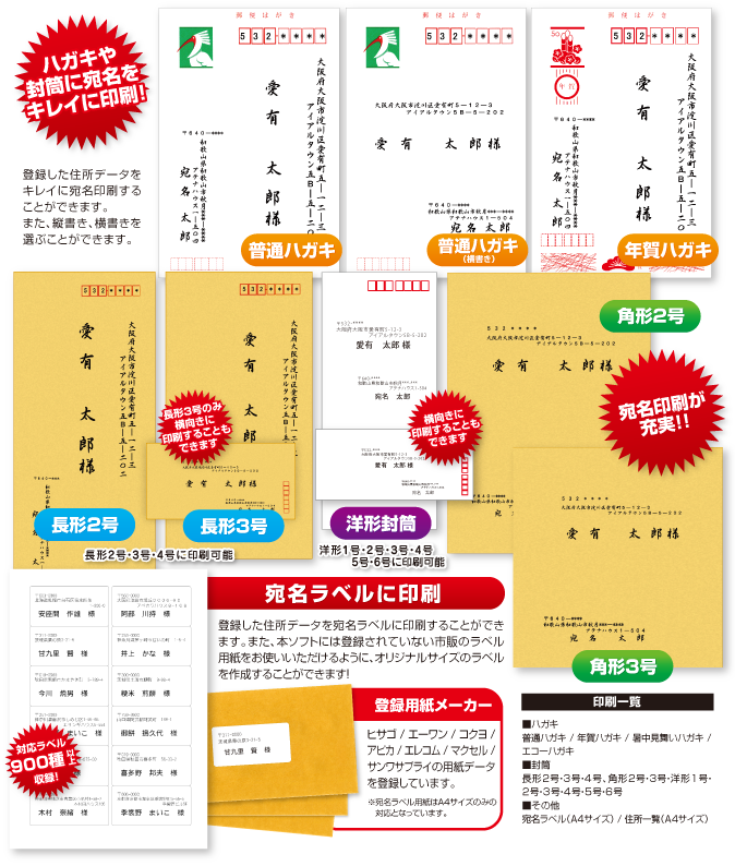 登録した宛名をハガキ、長形・角形・洋形の封筒、