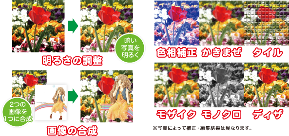 画像に効果をつけることができ、タイルやセピア、モノクロ、