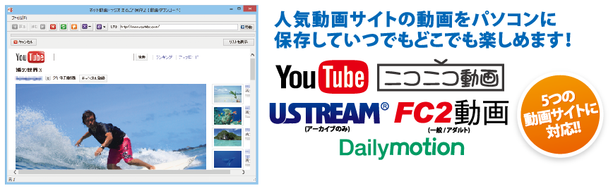 ※本ソフトはYouTube、ニコニコ動画、Dailymotion、USTREAM、FC2動画の動画をダウンロードして、