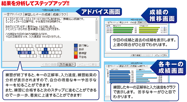 練習が終了するとキーごとの正解率、入力速度が表示され、