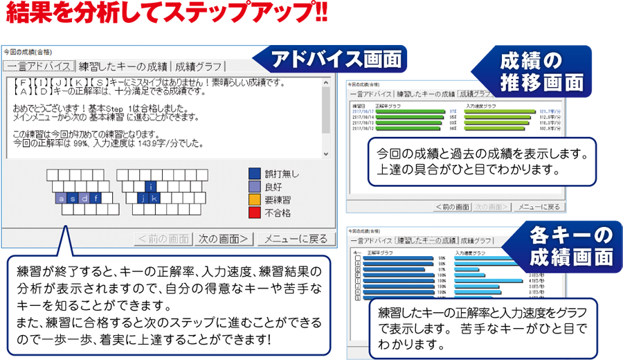 練習が終了するとキーごとの正解率、入力速度が表示され、